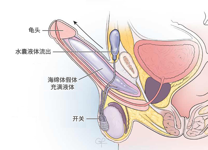 膨胀型阴茎假体手术涉及将可膨胀和收缩的圆柱体插入阴茎的勃起组织中。将泵放置在阴囊中,并将含有盐水溶液的储液器植入下腹部靠近骨盆骨的位置。通过操作阴囊内的可调节泵,可以实现立即勃起。这种方法复制了自然勃起的过程,目前被认为是治疗勃起功能障碍的最先进的手术方法。